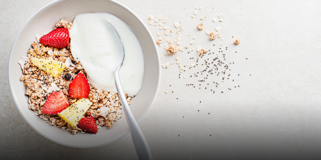 • Café da Manhã: Um iogurte com aveia e frutas.